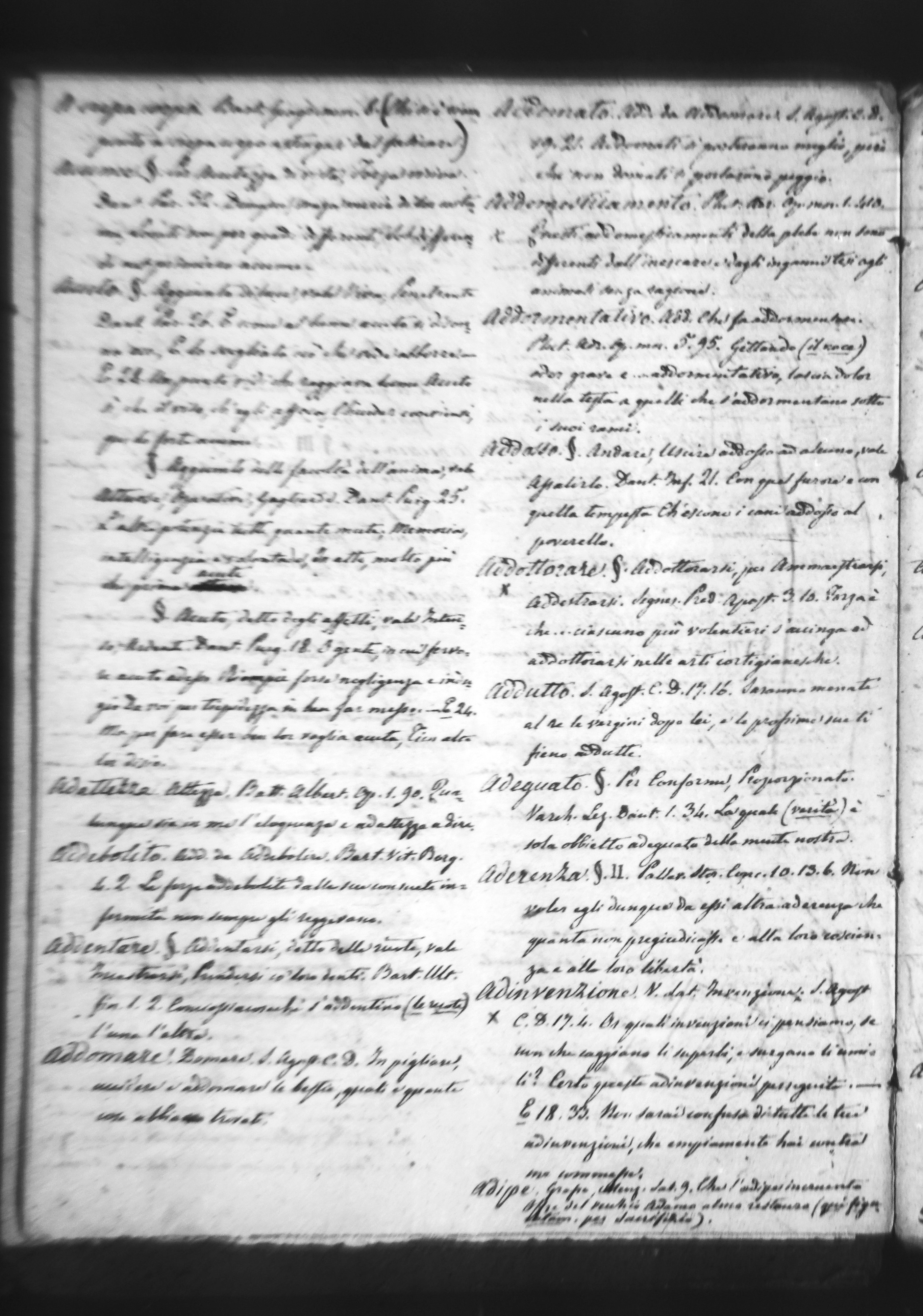 Addomato. Add. da Addomare. S. Agost. C. D. 19. 21. Addomati si porteranno meglio, però chè non domati si portarono peggio. [In TB l’esempio è accolto integralmente (con la sola variante formale di (ms.) però chè > (TB) perchè), al pari della fonte da cui è tratto, con la dichiarata attribuzione della paternità al Corsetto (compare infatti la sigla [Cors.]).] Addomesticamento. Plut. Adr. Op. mor. 1. 410. Questi addomesticamenti della plebe non sono differenti dall’inescare e dagli inganni tesi agli animali senza ragione. [In TB l’esempio è accolto integralmente, al pari della fonte da cui è tratto, con la dichiarata attribuzione della paternità al Corsetto (compare infatti la sigla [Cors.]).] Addormentativo. Add. Che fa addormentare. Plut. Adr. Op. mor. 5. 95. Gettando (il noce) odor grave e … addormentativo, lascia dolor nella testa a quelli che s’addormentano sotto i suoi rami. [In TB sono accolti la fonte e l’esempio, con la dichiarata attribuzione della paternità al Corsetto (compare infatti la sigla [Cors.]). Tuttavia, in TB, sebbene ci si riferisca alla medesima opera riportata nel ms., la fonte è indicata come Adr. M. Opusc. Plut. volg. 5. 95.; in TB, inoltre, anche l’esempio non corrisponde esattamente a quello presente nel ms.; si legge infatti: [Cors.] Adr. M. Opusc. Plut. volg. 5. 95. Nominarono il noce carian, perchè gettando odor grave e caroticon, cioè addormentativo, lascia dolor nella testa a quelli che s'addormentano sotto i rami suoi.] Addosso. §. Andare, uscire addosso ad alcuno, vale Assalirlo. Dant. Inf. 21. Con quel furore e con quella tempesta Ch’escono i cani addosso al poverello. [In TB l’esempio è accolto integralmente, al pari della fonte da cui è tratto, ma è attribuito a (C).] Addottorare.[2] §. Addottorarsi, per Ammaestrarsi, Addestrarsi. Segner. Pred. Apost. 3. 10. Forza è … ciauscuno più volentieri s’accinga ad addottorarsi nelle arti cortigianesche. [In TB sono accolti la fonte e l’esempio (in versione ridotta), con la dichiarata attribuzione della paternità al Corsetto (compare infatti la sigla [Cors.]).] Addutto. S. Agost. C. D. 17. 16. Saranno menate al re le vergini dopo lei, e le prossime sue ti fieno addutte. [In TB l’esempio è accolto integralmente, al pari della fonte da cui è tratto, con la dichiarata attribuzione della paternità al Corsetto (compare infatti la sigla [Cors.]), sebbene s.v. addotto, poiché addutto è ritenuta variante obsoleta di addotto (accanto alla voce compare infatti la ben nota crocellina †).] Adeguato. §. Per Conforme, Proporzionato. Varch. Lez. Dant. 1. 34. La quale (verità) è sola obbietto adeguato della mente nostra. [In TB l’esempio è accolto integralmente, al pari della fonte da cui è tratto, con la dichiarata attribuzione della paternità al Corsetto (compare infatti la sigla [Cors.]).] Aderenza. §. II. Pallav. Stor. Conc. 10. 13. 6. Non voler egli dunque da essi altra aderenza che quanta non pregiudicasse e alla loro coscienza e alla loro libertà. [In TB l’esempio è accolto integralmente, al pari della fonte da cui è tratto, con la dichiarata attribuzione della paternità al Corsetto (compare infatti la sigla [Cors.]).] Adinvenzione.[3] V. Lat. Invenzione. S. Agost. C. D. 17. 4. Or quali invenzioni ci pensiamo, se non che caggiano li superbi, e surgano li umili? Certo queste adinvenzioni, perseguita. _ E 18.33. Non sarai confuso di tutte le tue adinvenzioni, che empiamente hai contra me commesse. [In TB sono accolti gli esempi forniti da Corsetto (il primo in versione ampliata), così come le fonti da cui sono tratti; tuttavia, essi si ritrovano s.v. adivenzione. Qui, non soltanto compare la sigla [Cors.], ma l’intera redazione della voce appartiene al Corsetto.] Adipe. Grasso. Menz. Sat. 9. Che l’adipe incruento offre del vecchio Adamo almo restauro (qui figuratam. per sacrifizio). [In TB l’esempio è accolto integralmente, al pari della fonte da cui è tratto, ma è attribuito a (C).] [CT] |